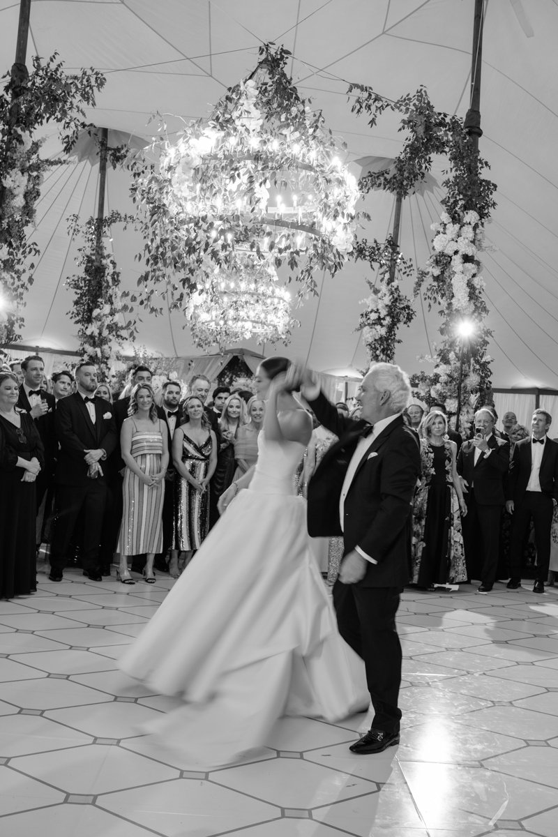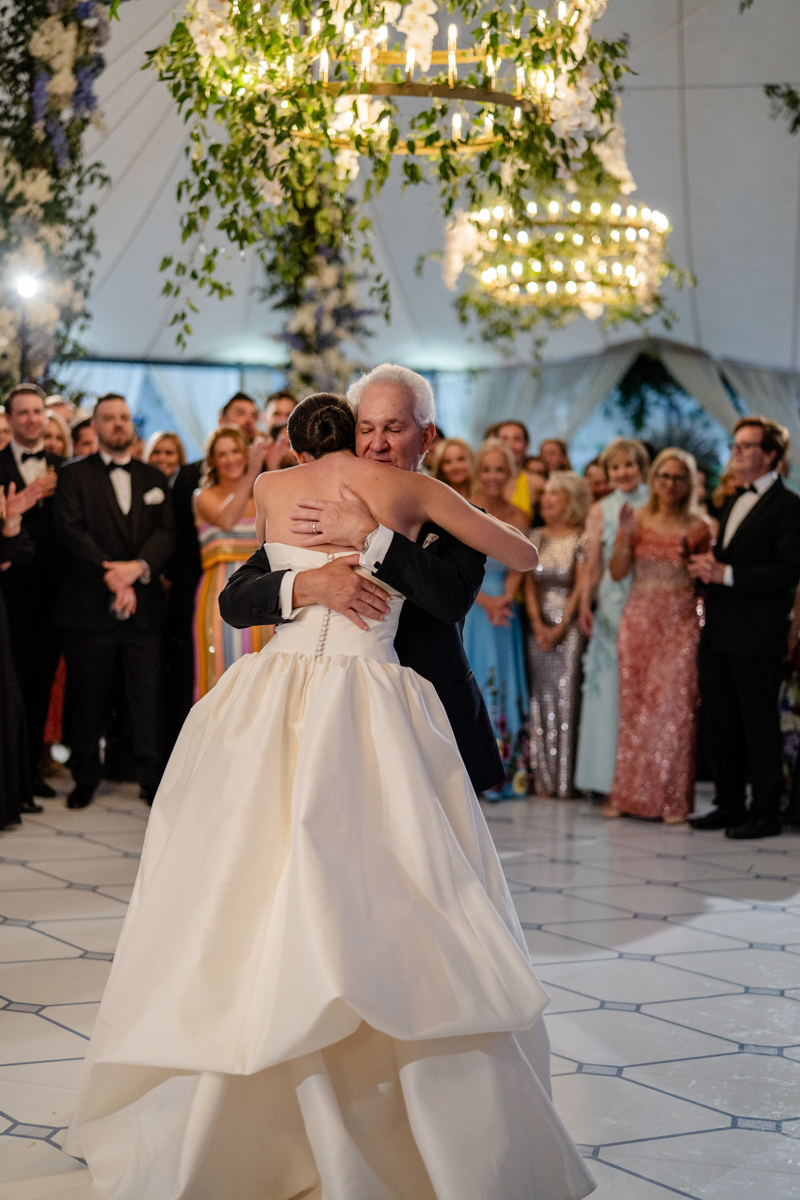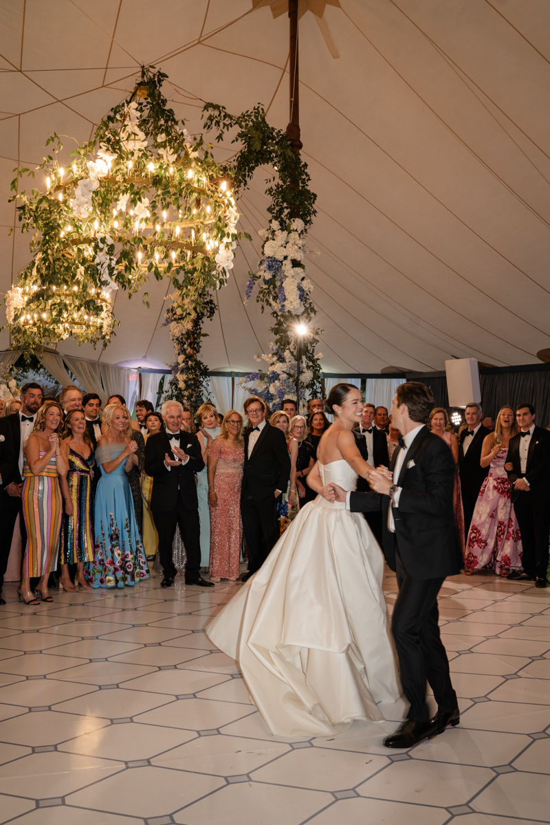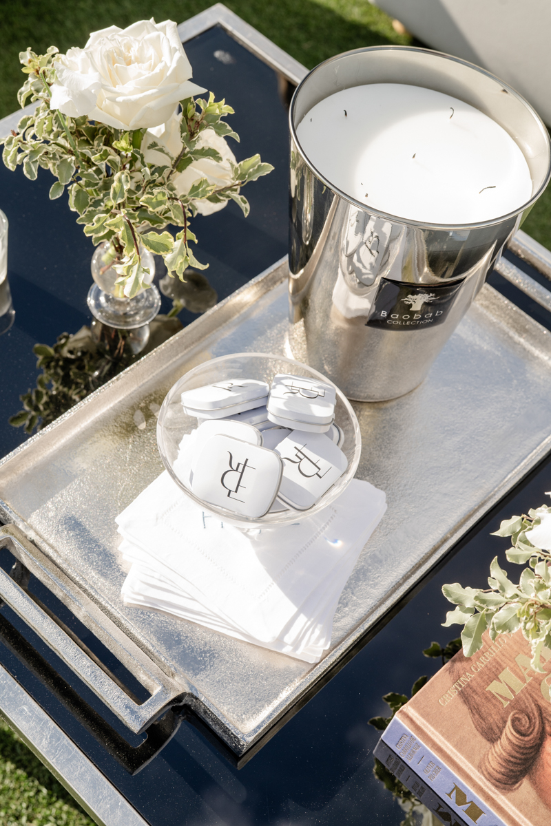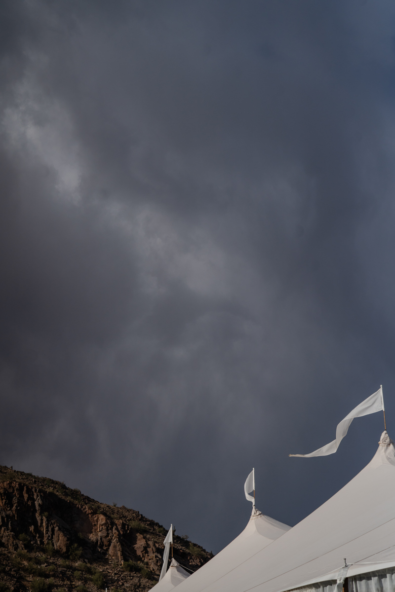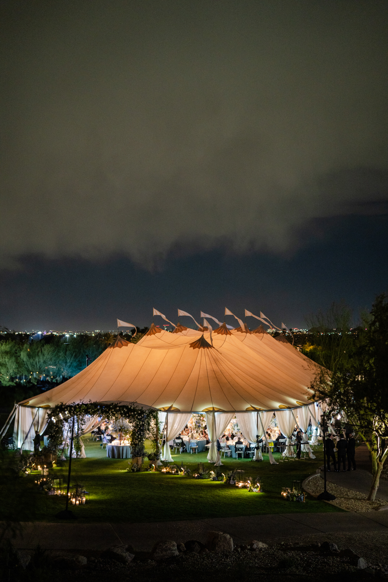 As dusk turned to evening, the celebration moved into a grand open-sided tent set on The Phoenician’s expansive event lawn. The tent glowed from within—thanks to crystal chandeliers, strings of twinkling café lights, and soft up-lighting in shades of sky and sand. Billowing white drapery created the feeling of being inside a seaside cabana, despite being surrounded by cacti and desert palms.