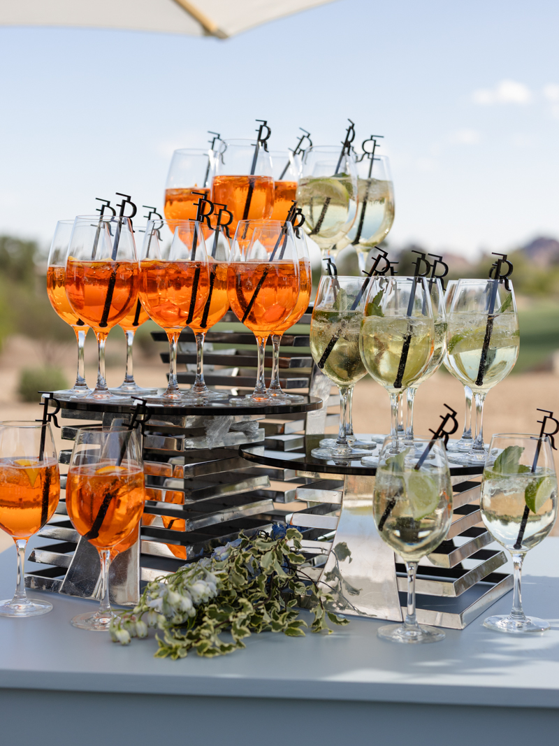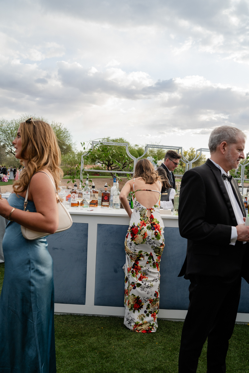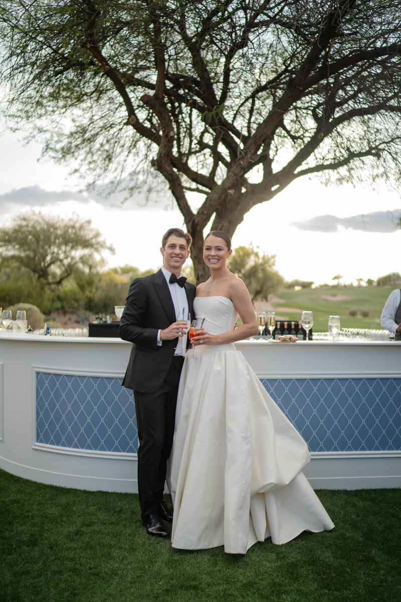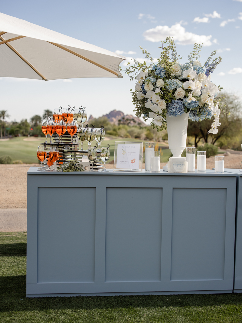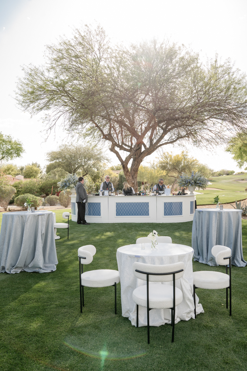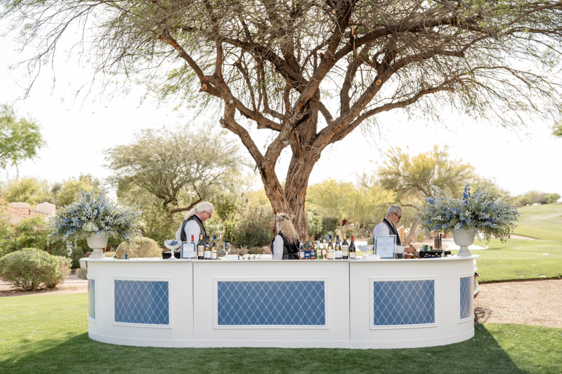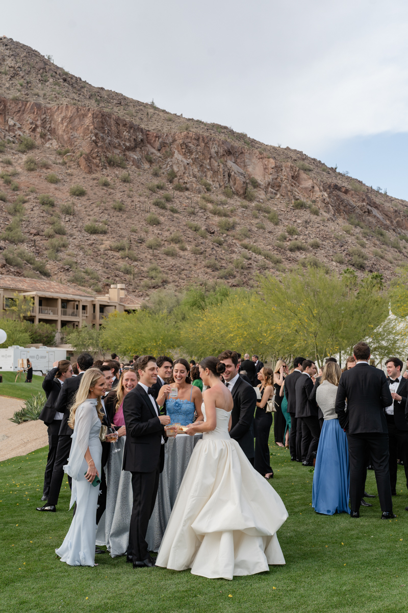 After the ceremony, guests were escorted to the 18th hole of The Phoenician’s championship golf course for a one-of-a-kind cocktail hour. With panoramic views of the valley and a soft desert breeze rolling in, this elevated location offered the perfect transition from “I do” to celebration.
