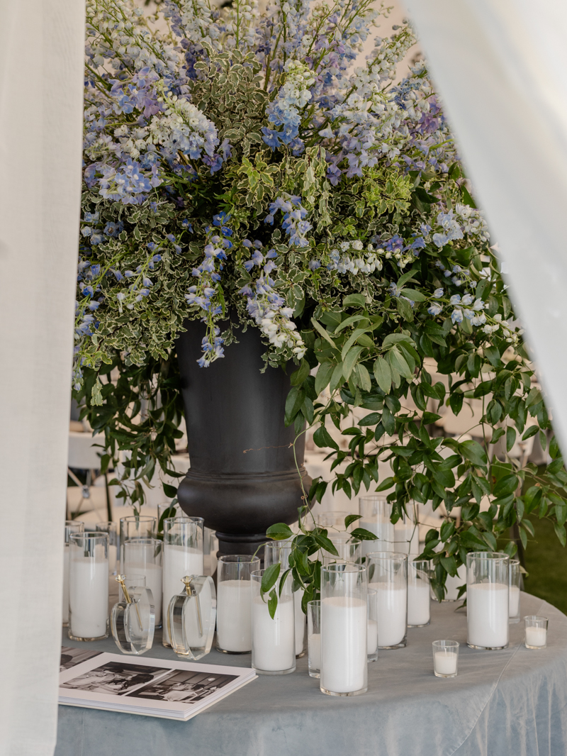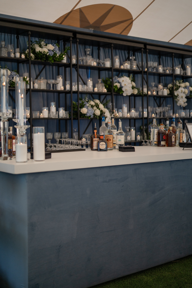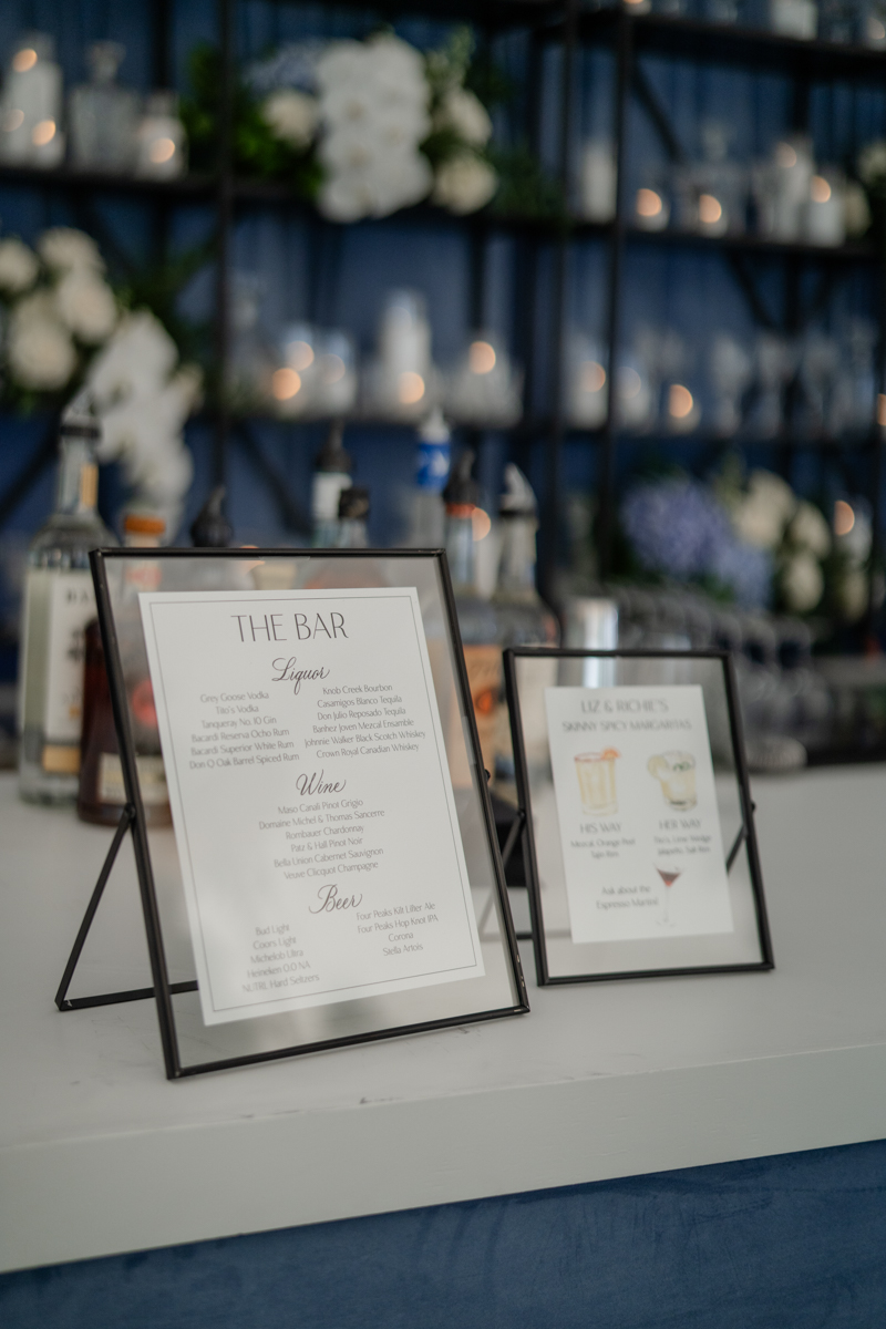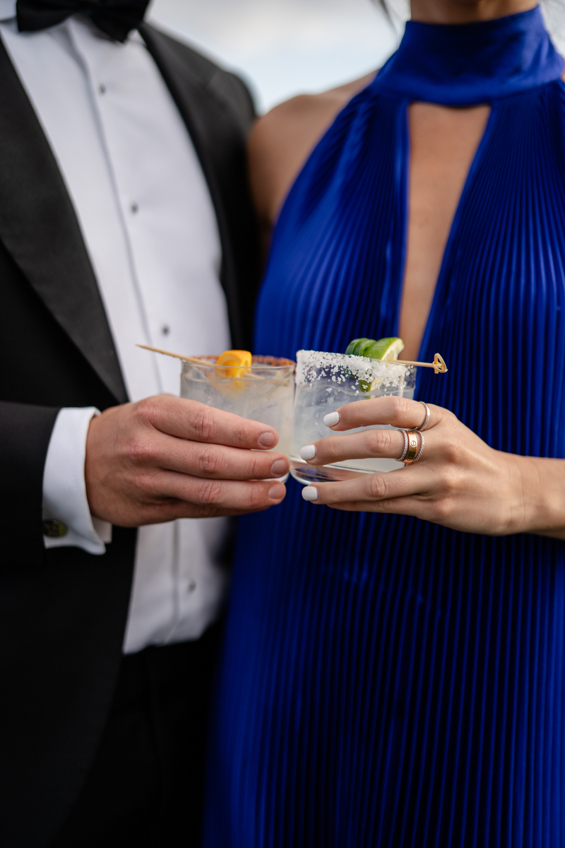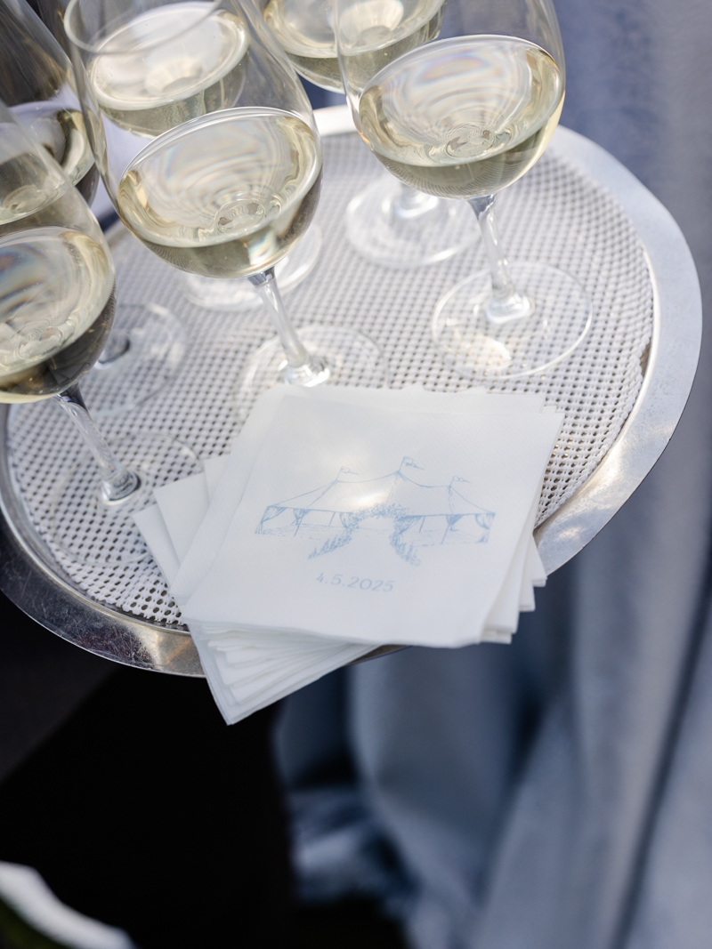 Cocktail tables were dressed in linen with blue watercolor overlays, and waiters held custom monogramed napkins. A live band played covers of modern love songs while guests mingled, took in the view, and sampled bites and an Aperol Spritz Bar.