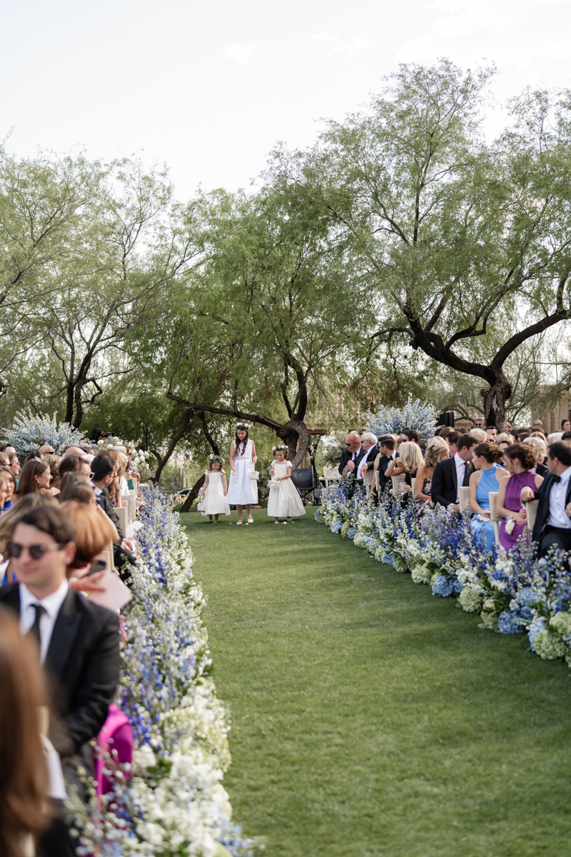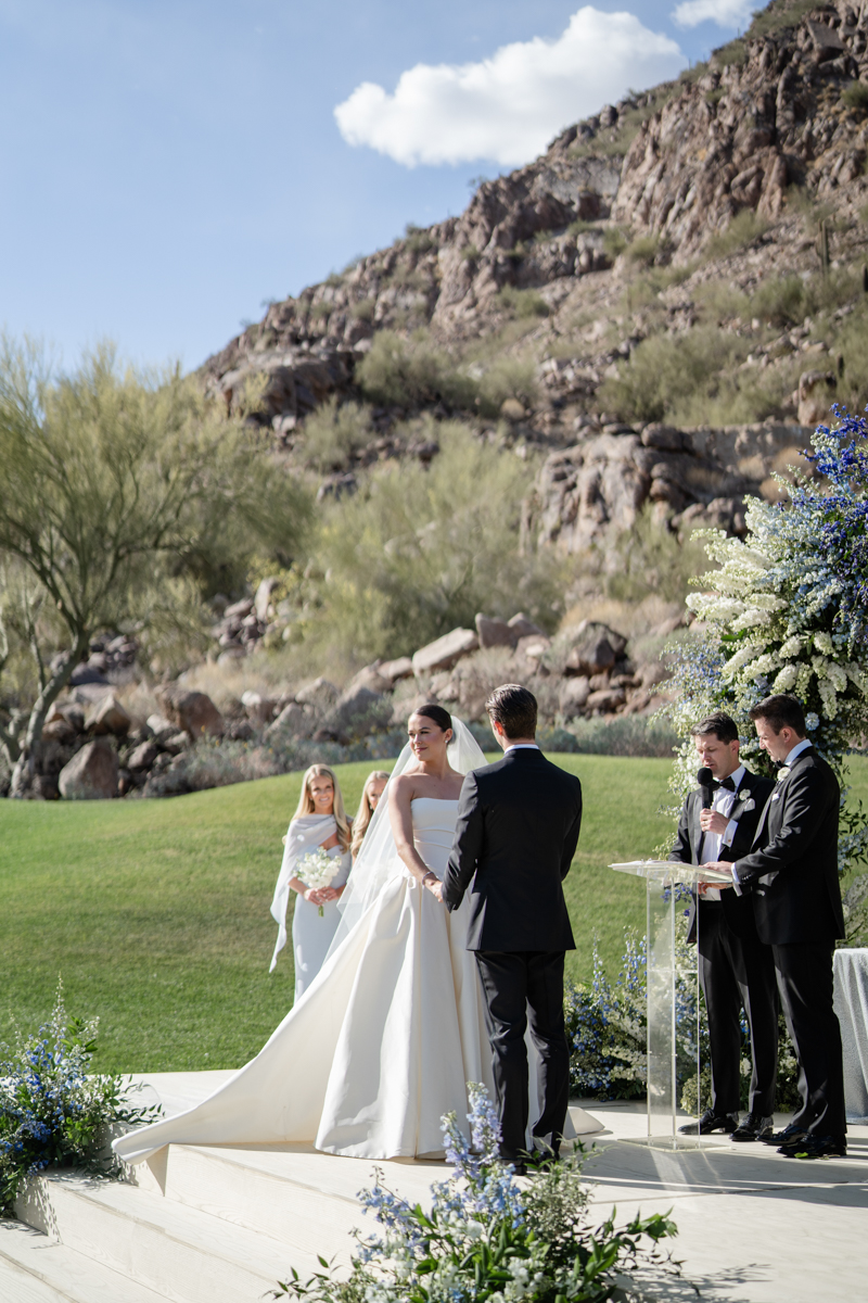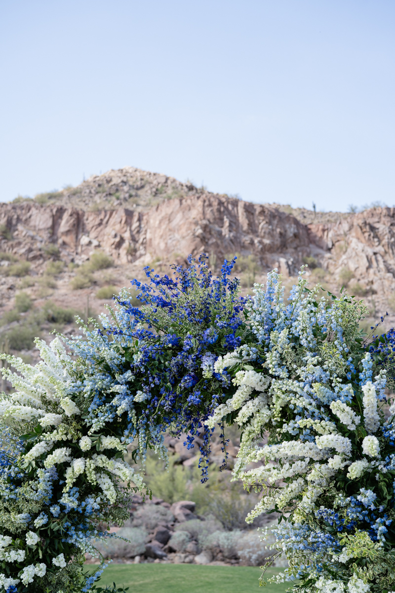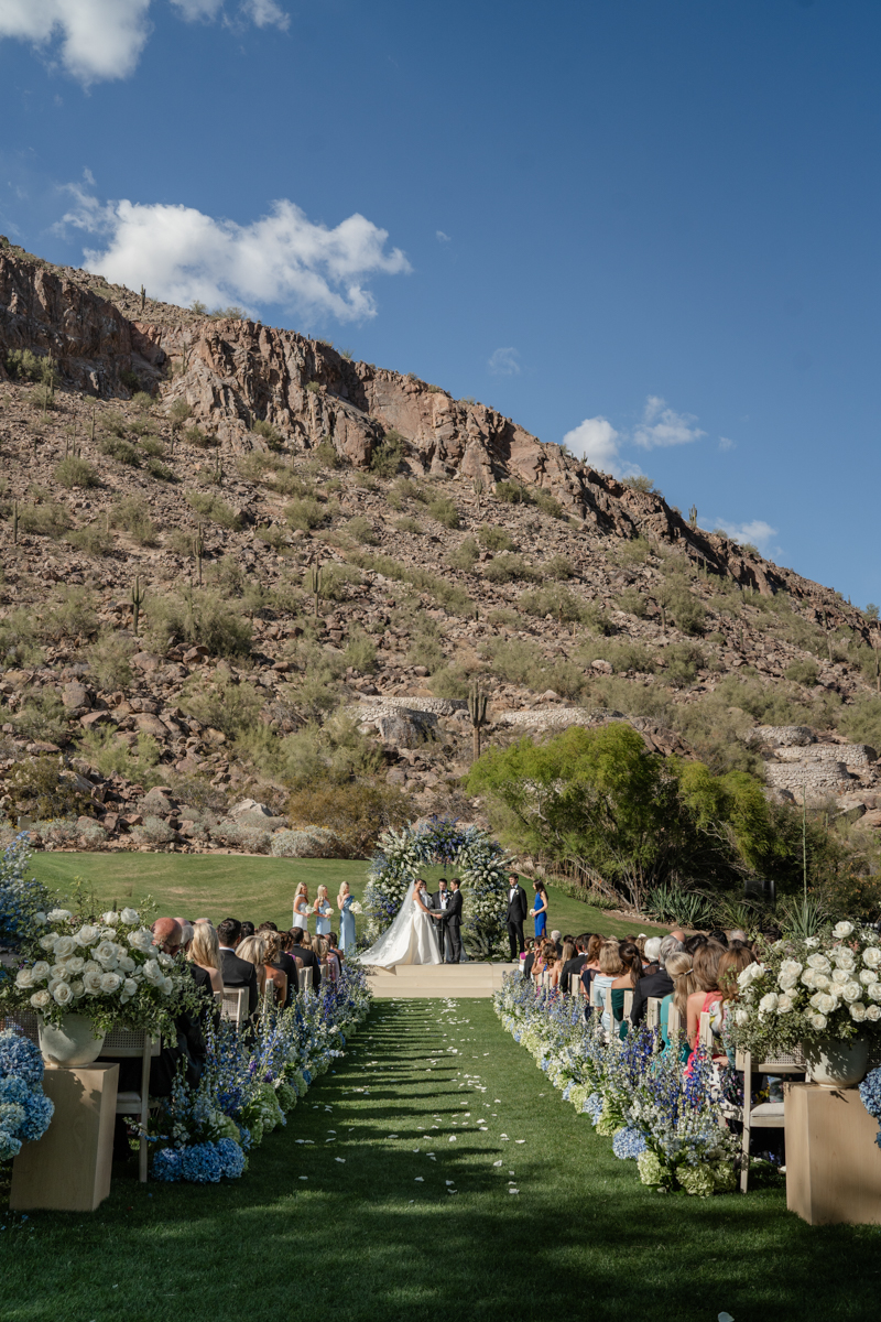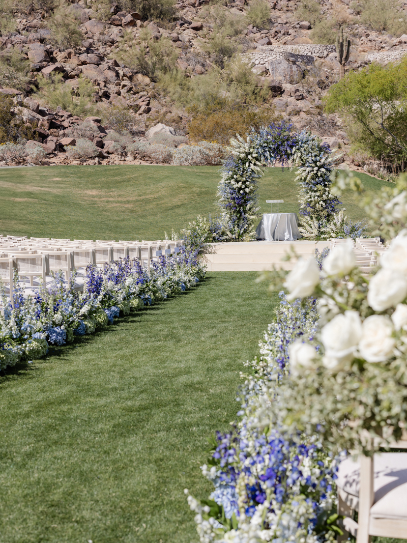 The wedding ceremony took place just before sunset on The Phoenician’s manicured lawn, with the golden glow of the desert casting long shadows and Camelback Mountain rising dramatically behind the altar. The scene was ethereal—rows of white chairs lined up beneath an open sky, facing a delicate floral arch dripping with hydrangeas, delphinium, pale roses, and airy greenery in varying shades of blue and ivory.
