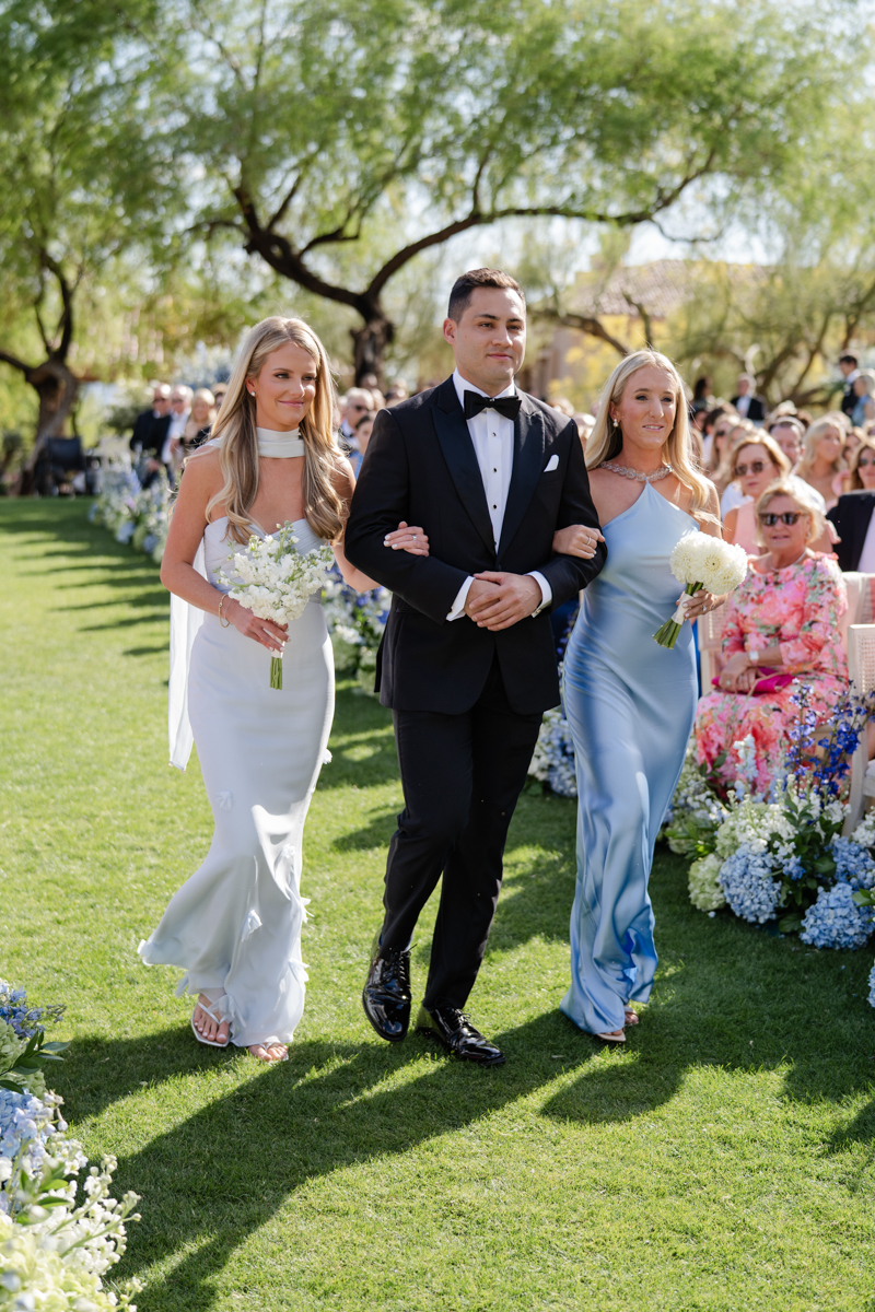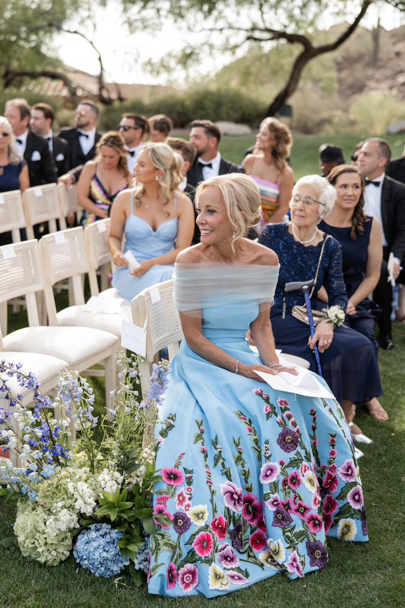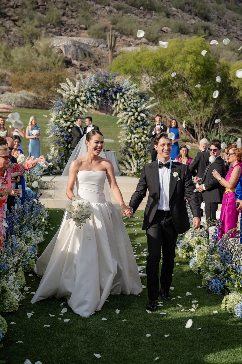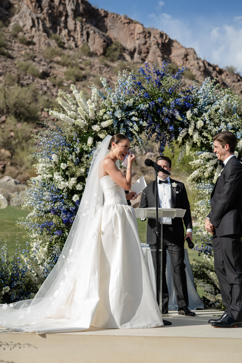 The wedding ceremony took place just before sunset on The Phoenician’s manicured lawn, with the golden glow of the desert casting long shadows and Camelback Mountain rising dramatically behind the altar. The scene was ethereal—rows of white chairs lined up beneath an open sky, facing a delicate floral arch dripping with hydrangeas, delphinium, pale roses, and airy greenery in varying shades of blue and ivory.