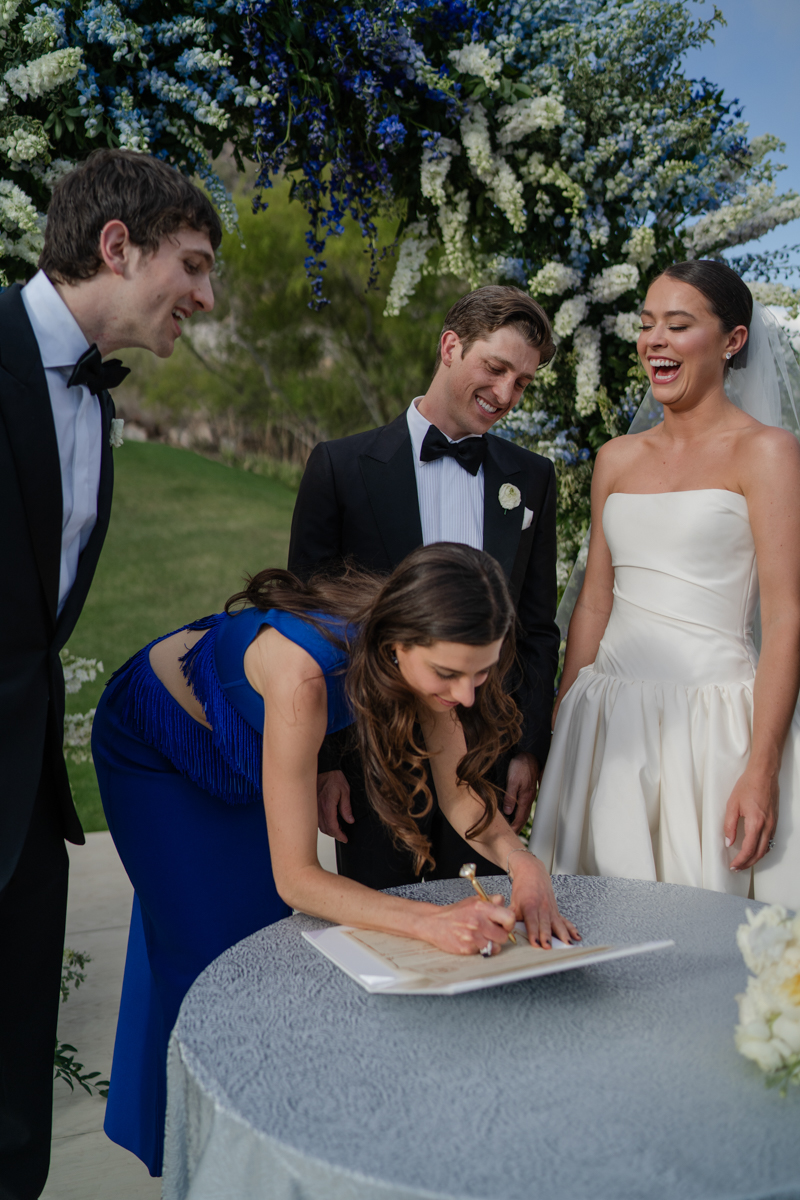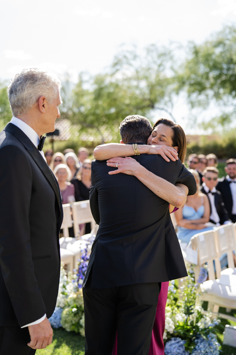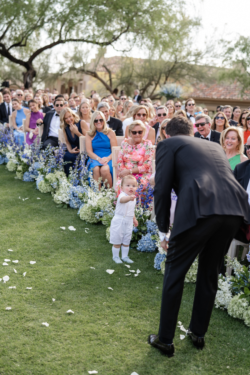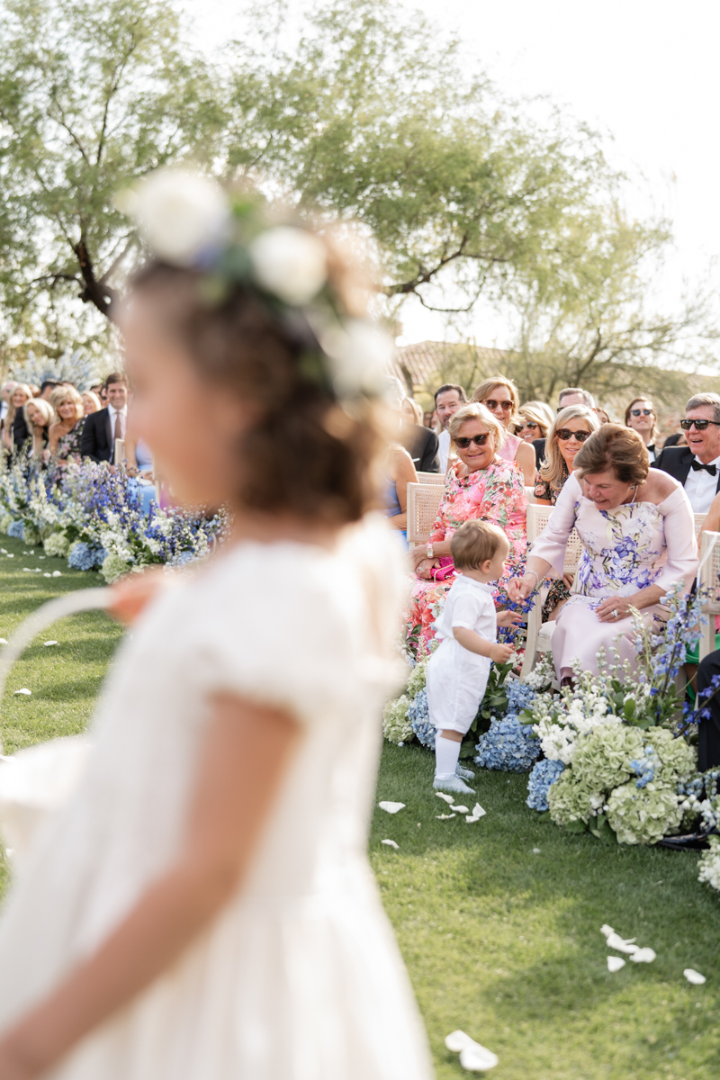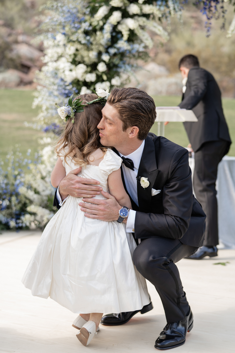 The wedding ceremony took place just before sunset on The Phoenician’s manicured lawn, with the golden glow of the desert casting long shadows and Camelback Mountain rising dramatically behind the altar. The scene was ethereal—rows of white chairs lined up beneath an open sky, facing a delicate floral arch dripping with hydrangeas, delphinium, pale roses, and airy greenery in varying shades of blue and ivory.